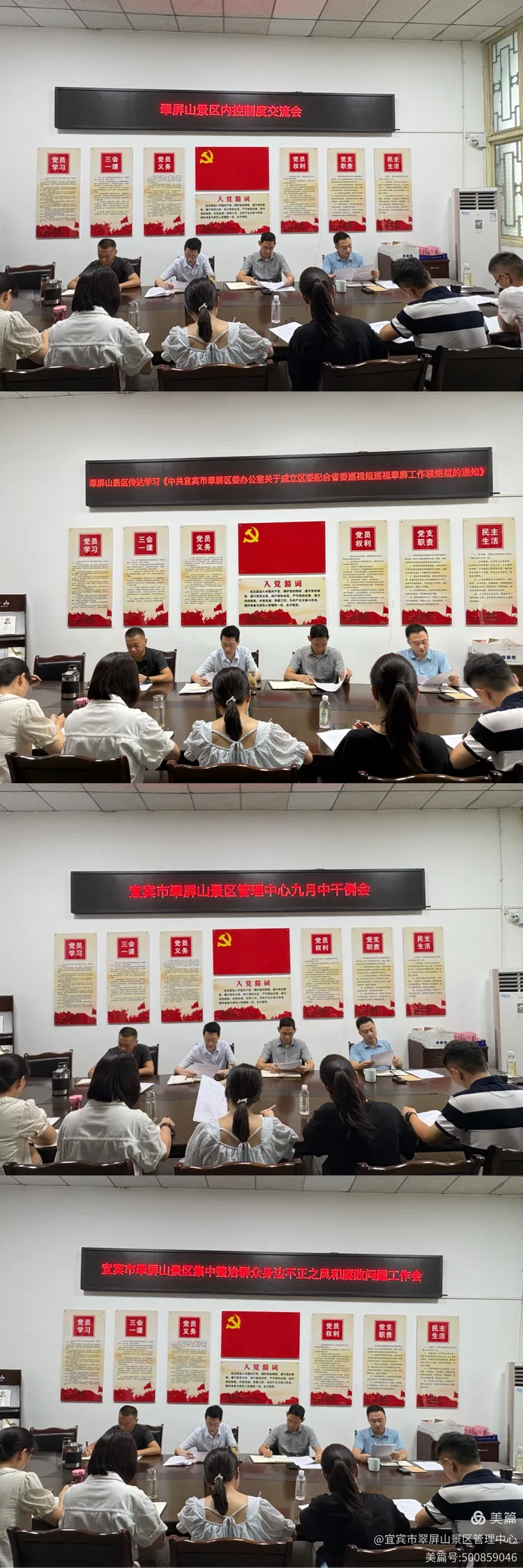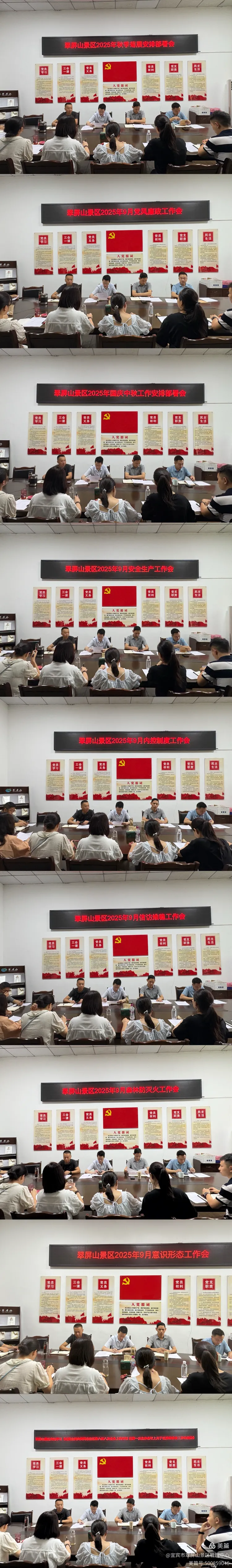 翠屏山景区传达学习《中共宜宾市翠屏区委办公室关于成立区委配合省委巡视组巡视翠屏工作联络组的通知》、传达学习《区委主要负责同志在区委六届八次全会上的讲话 在第一次全体会议上关于区委常委会工作的报告》;组织召开宜宾市翠屏山景区管理中心九月中干例会翠屏山景区内控制度交流会、宜宾市翠屏山景区集中整治群众身边不正之风和腐败问题工作会、翠屏山景区2025年9月森林防灭火工作会、翠屏山景区2025年9月意识形态工作会、翠屏山景区2025年9月信访维稳工作会、翠屏山景区2025年9月内控制度工作会、.翠屏山景区2025年9月份安全生产工作会、翠屏山景区2025年9月党风廉政工作会、翠屏山景区2025年国庆中秋工作安排部署会、翠屏山景区2025年秋季菊展安排部署会。