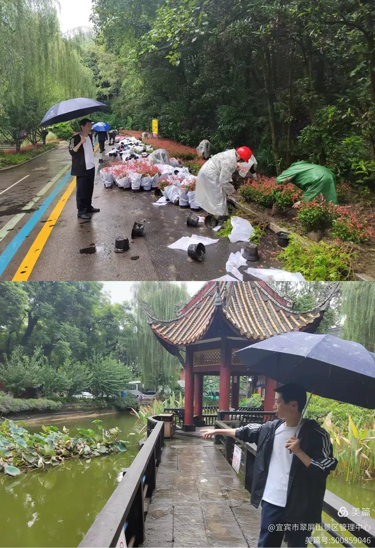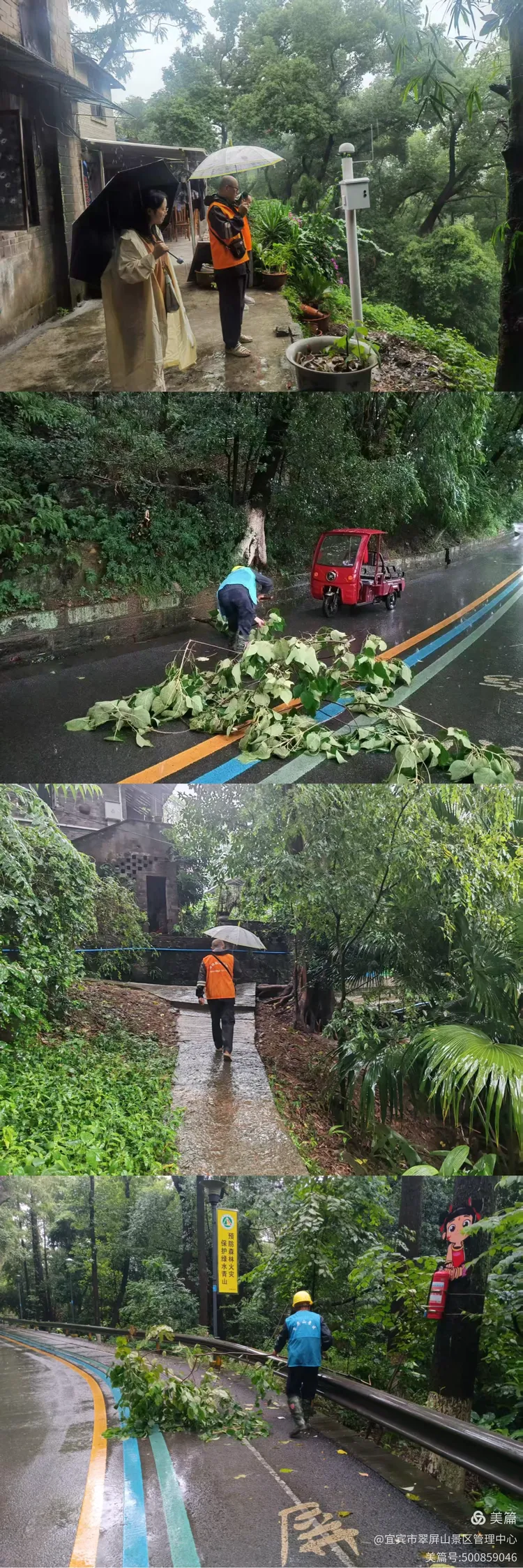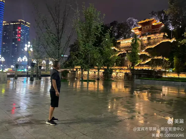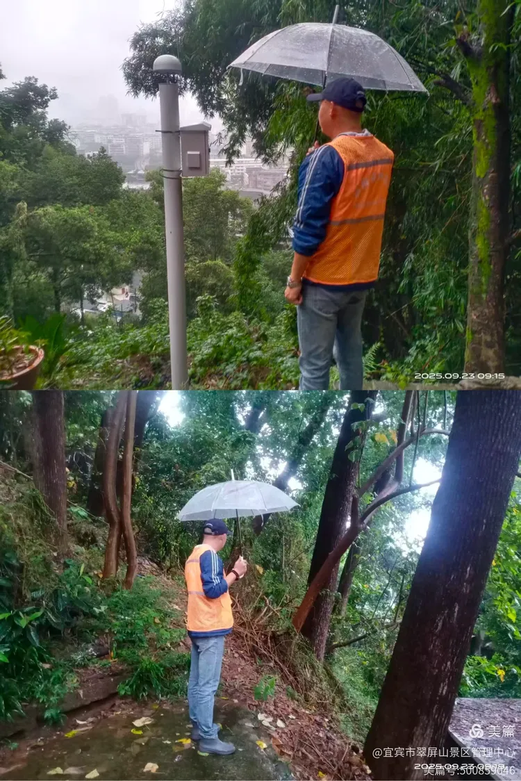 翠屏山景区黄主任带队雨中巡查真武山景观亮化设备,确保暴雨期间照明设施安全运行。