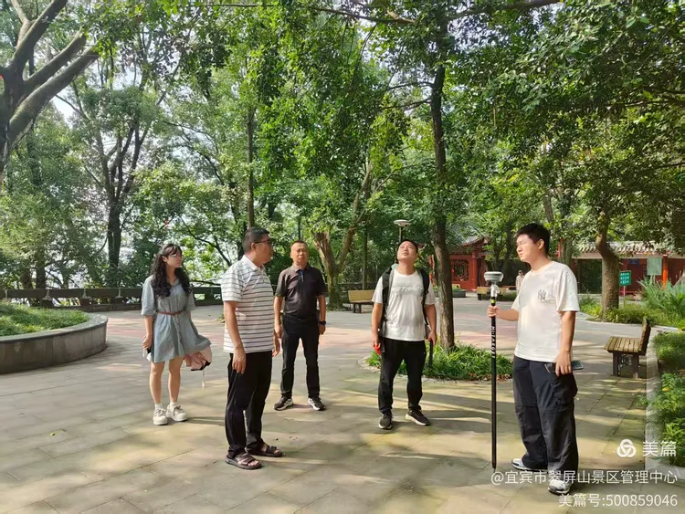 翠屏山景区带勘测公司在三江一揽楼和哪吒行宫进行点位查看,进行施工前准备工作。