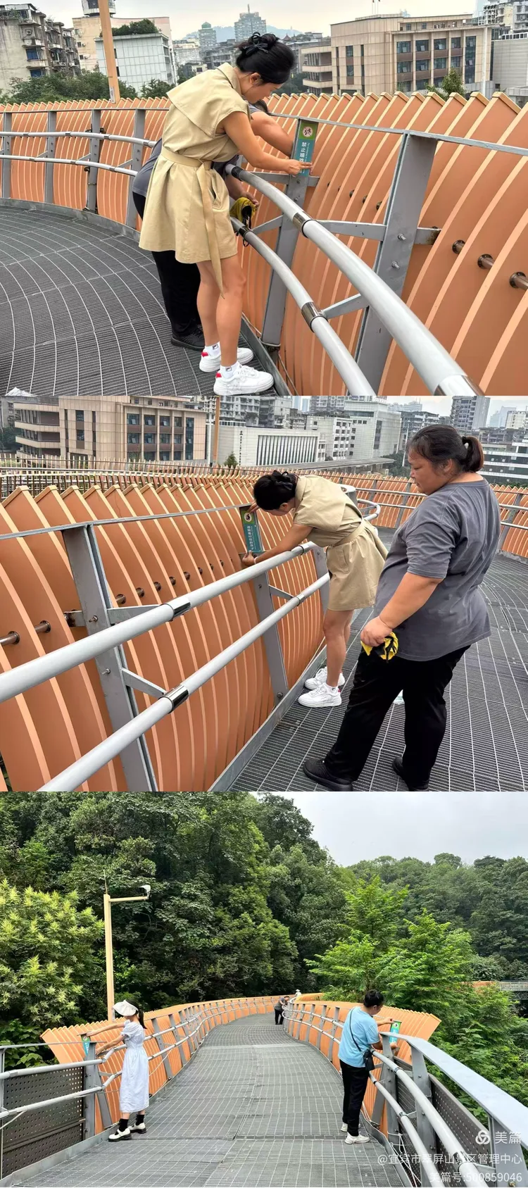 翠屏山景区对人行栈桥损坏提示标语进行更换。