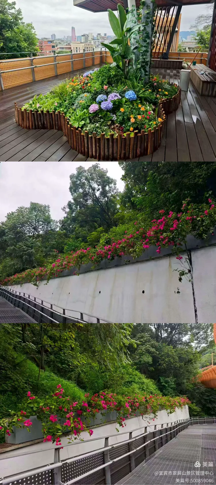 翠屏山景区人行栈桥平台花镜和中段挡墙刷乳胶漆、三角梅垂直绿化栽植完成,为国庆中秋呈现不一样绿化景观。