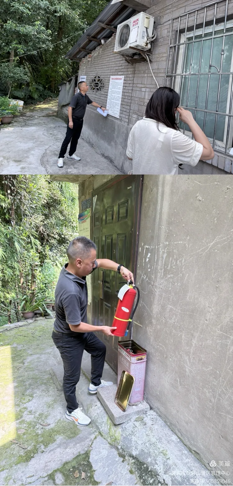 翠屏山景区黄主任带队检查真武山居民点房屋安全、消防安全,落实“雨前检查、雨中巡查,雨后核查”,力保安全。
