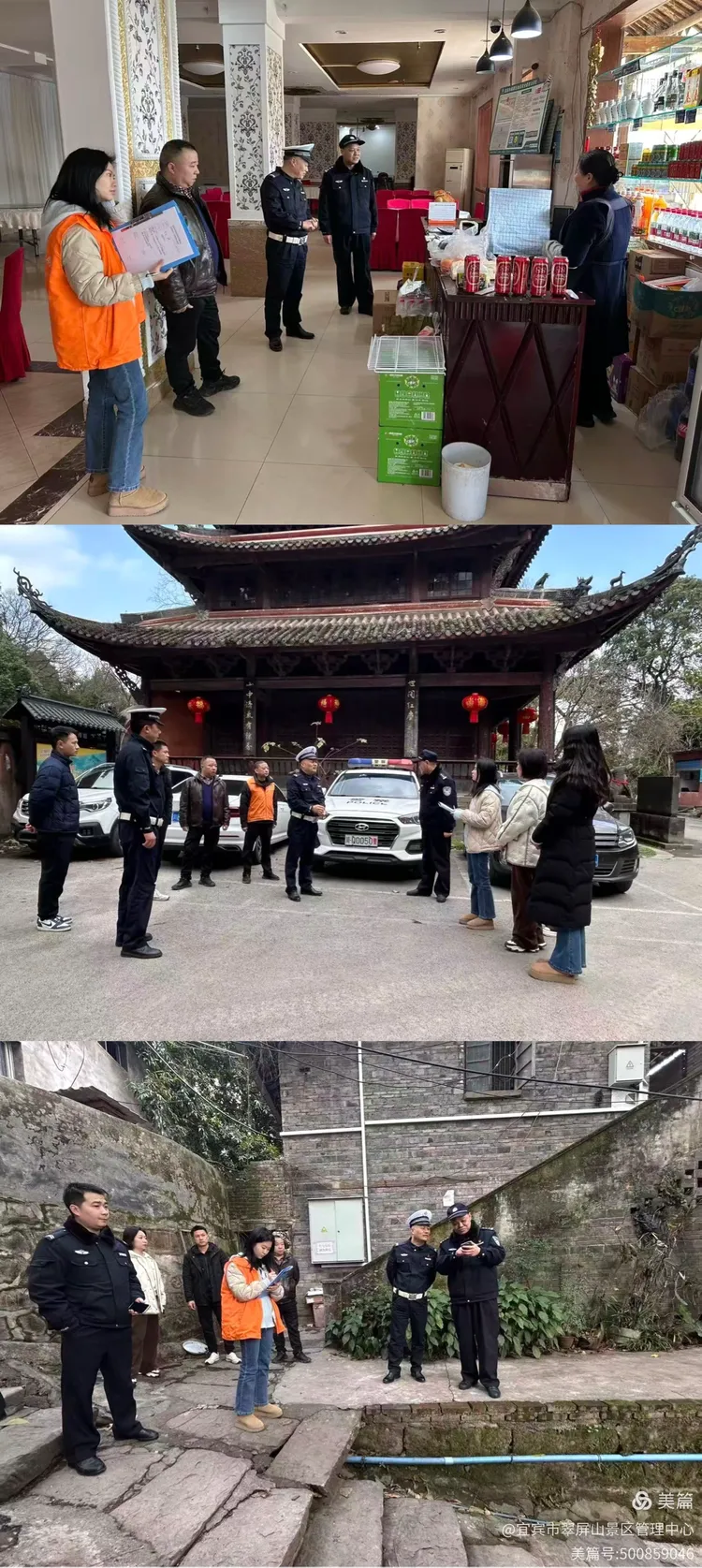 翠屏山景区管理中心副主任黄浩带队进行春节前安全检查,重点对景区经营点的食品安全、房屋安全、消防安全进行检查,对观光车、索道进行检查,发放消防检查指导手册和宜宾市翠屏山保护条例,要求各经营业主务必压实安全责任、提升优质服务。